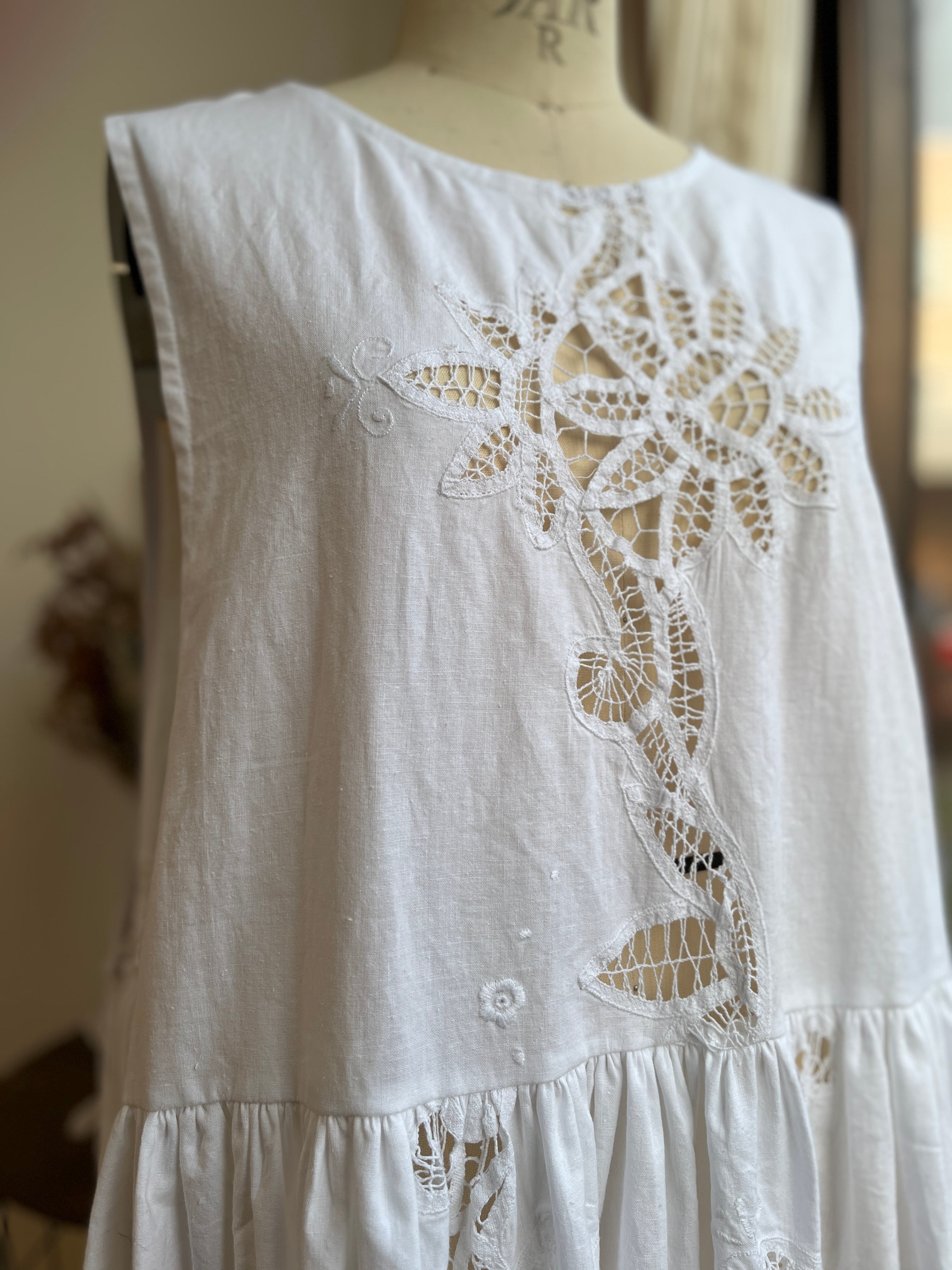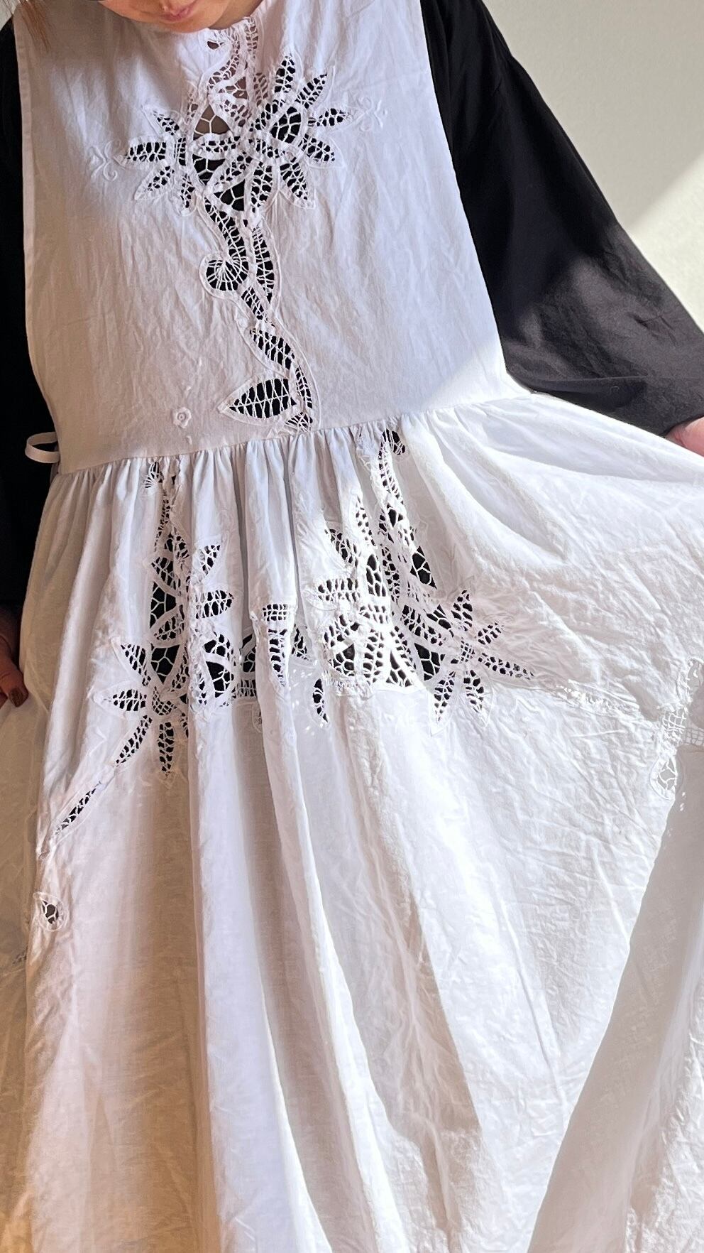 ヨーロッパのヴィンテージクロスを使用して仕立てたエプロンワンピースです。