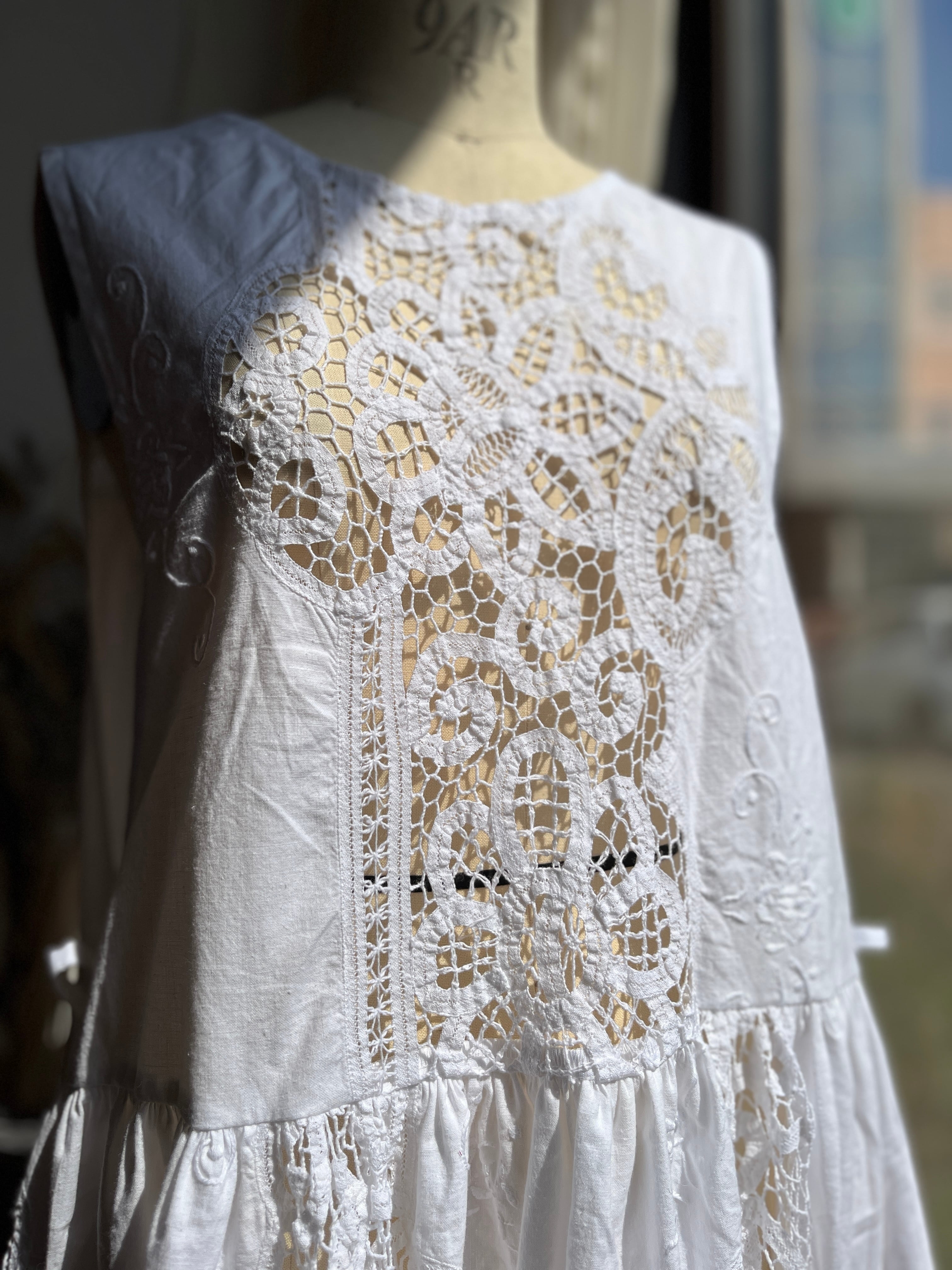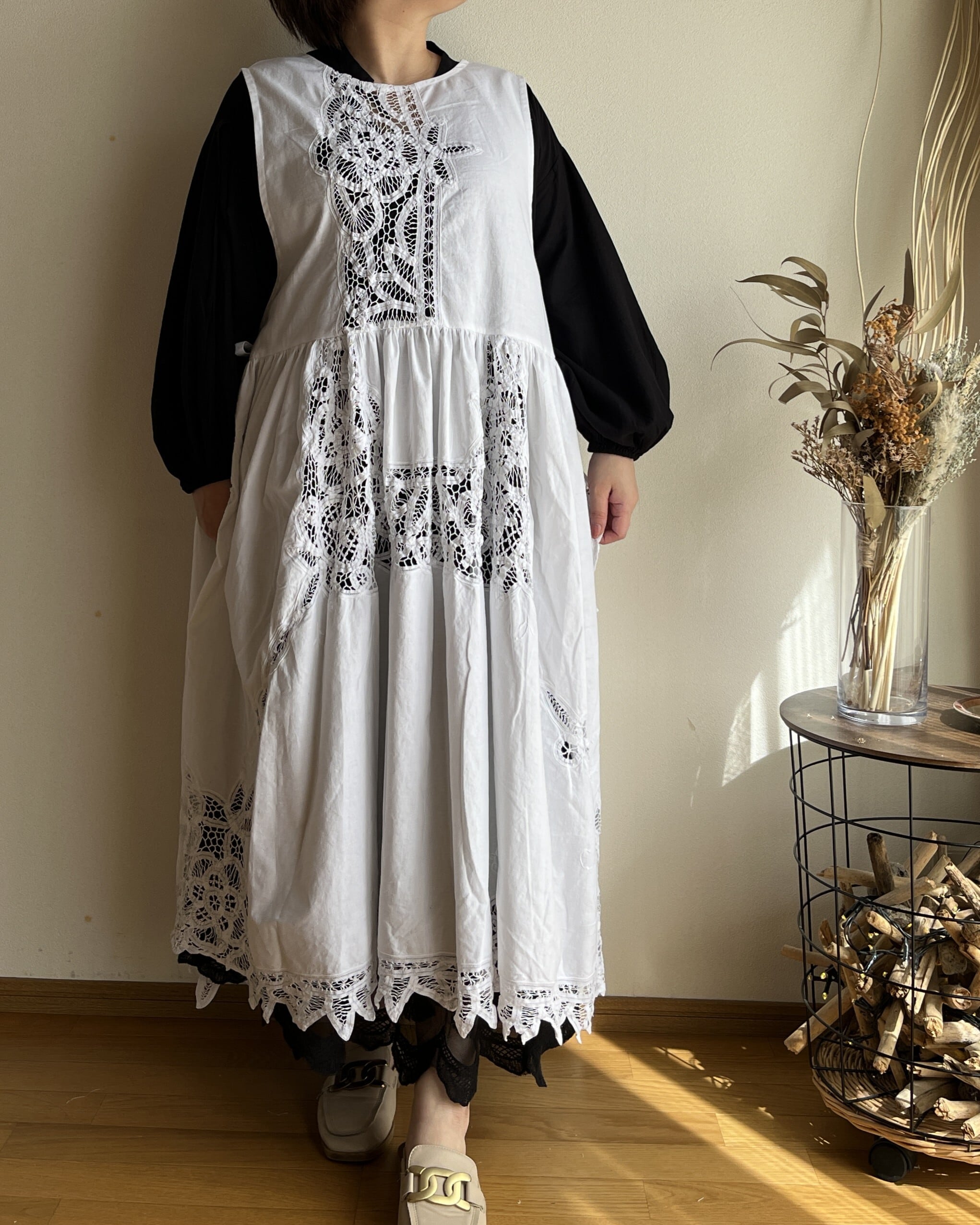 ヨーロッパのヴィンテージクロスを使用して仕立てたエプロンワンピースです。